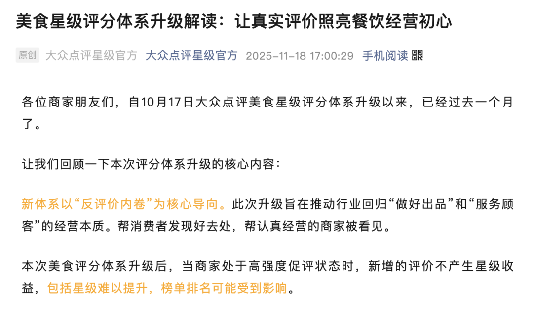 2025年10月17日起,大众点评开始实施美食星级评分体系升级,新体系以“反评价内卷”为核心导向,当酒店存在频繁邀评、索评行为时,新增评价将不产生星级收益,不仅星级难以提升,还可能影响餐饮相关榜单排名。