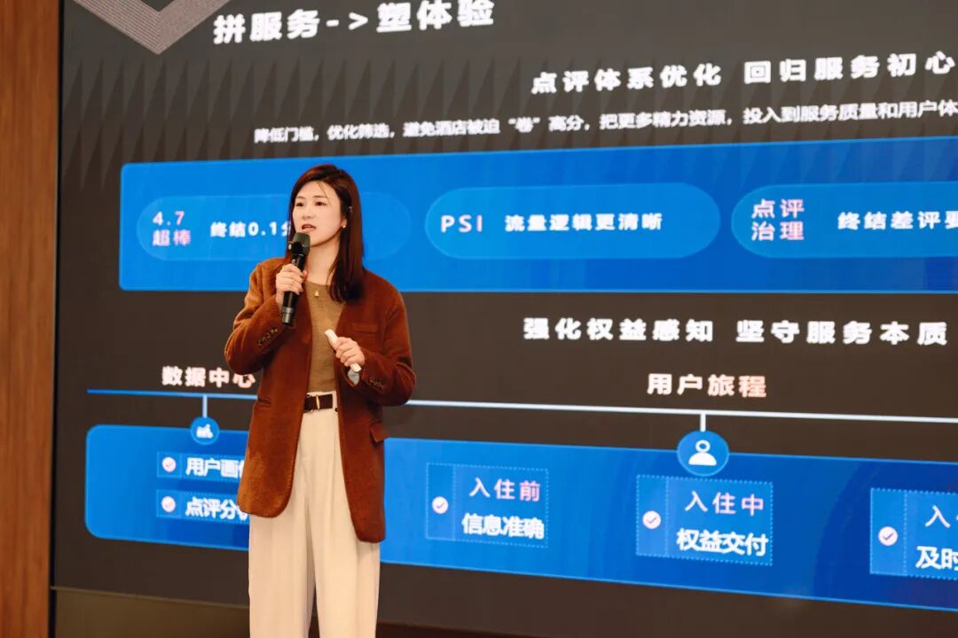 他强调,当前行业应从价格内卷转向内容深耕与营销转型,面对 95 后、00 后等年轻化客群,性价比与品质成为核心竞争力。集团将华客点评分数与总经理考核直接挂钩,按不同品牌设定差异化标准,中端品牌最低及格线为 4.7 分,更高层级品牌要求达 4.8 分,并根据携程点评政策动态调整。