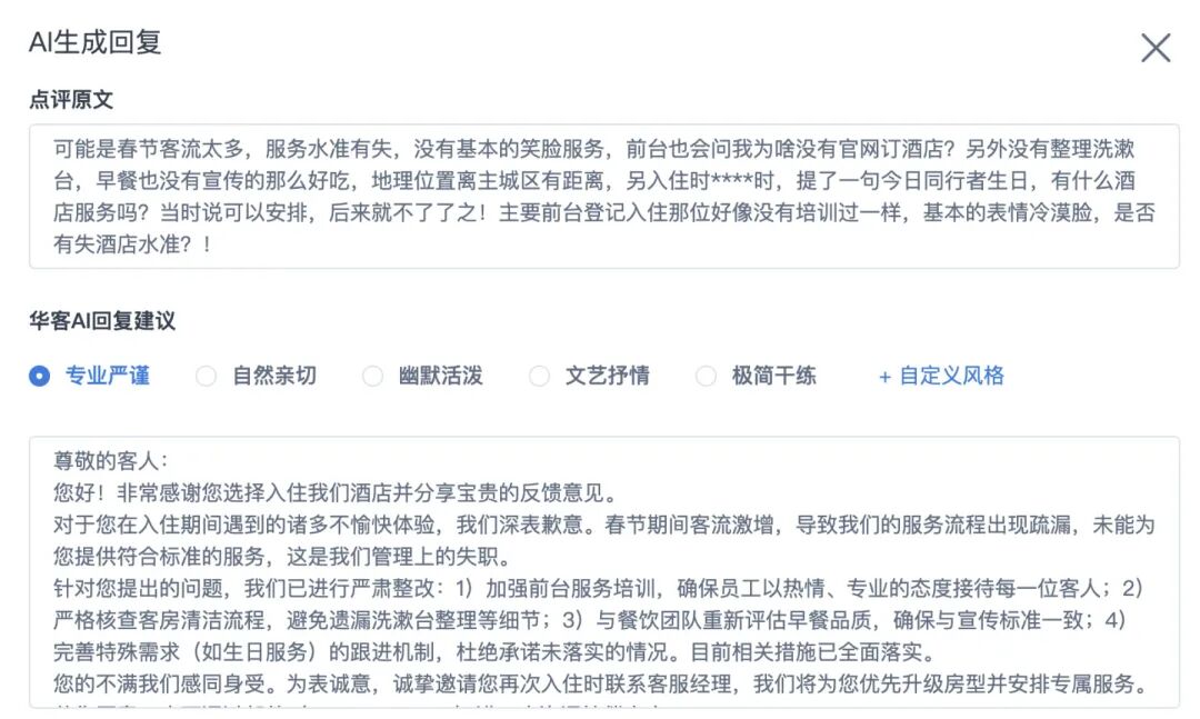 相比缺乏系统、经验不足的社会餐饮,酒店早已在客房点评管理中积累了成熟的合规方法论,尤其借助华客系统,更是摸索出了一套 “不触线、提真分” 的核心逻辑。