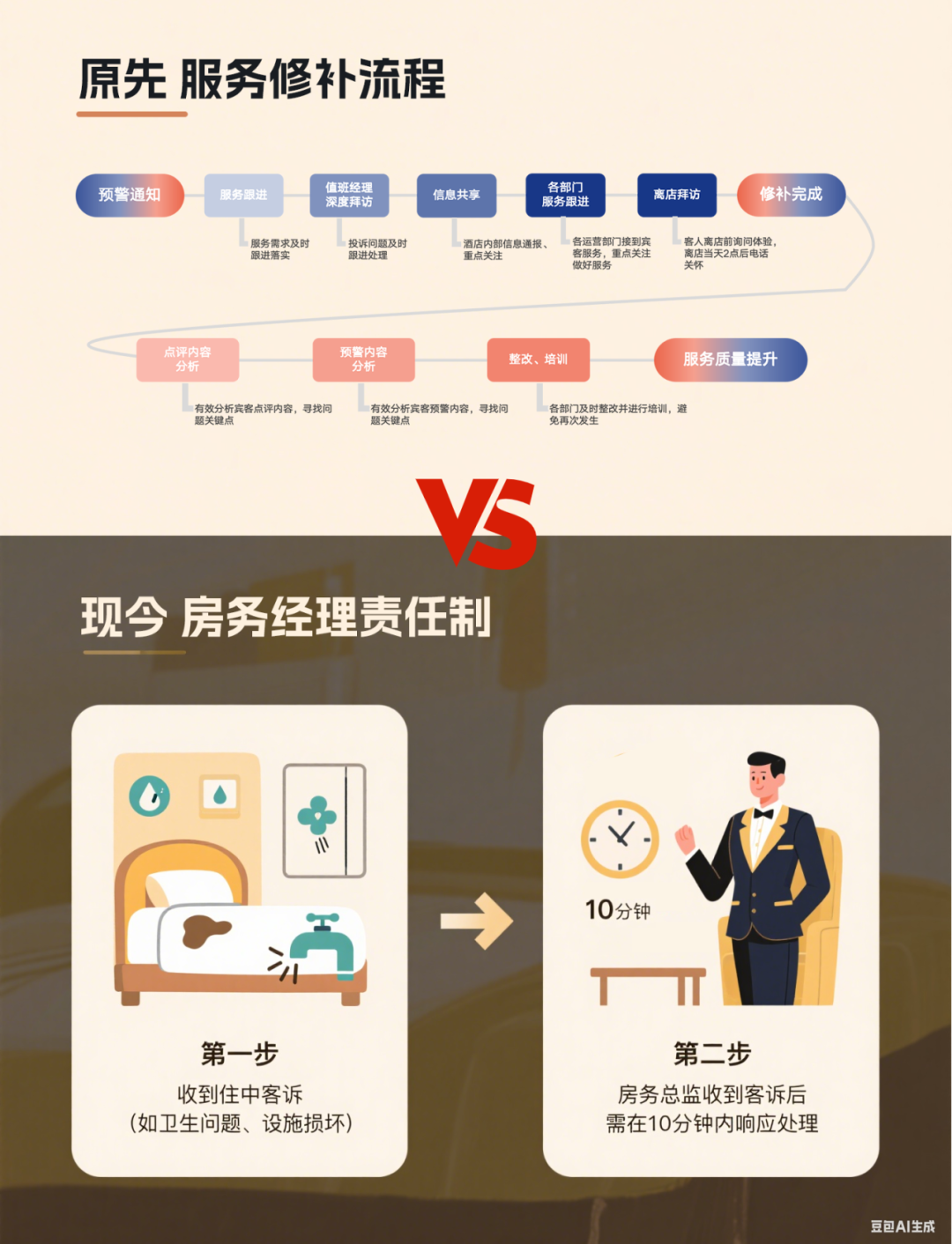 三是数字化工具的 “倒逼”,通过华客系统的住中预警、点评分析,及时发现服务问题并整改。