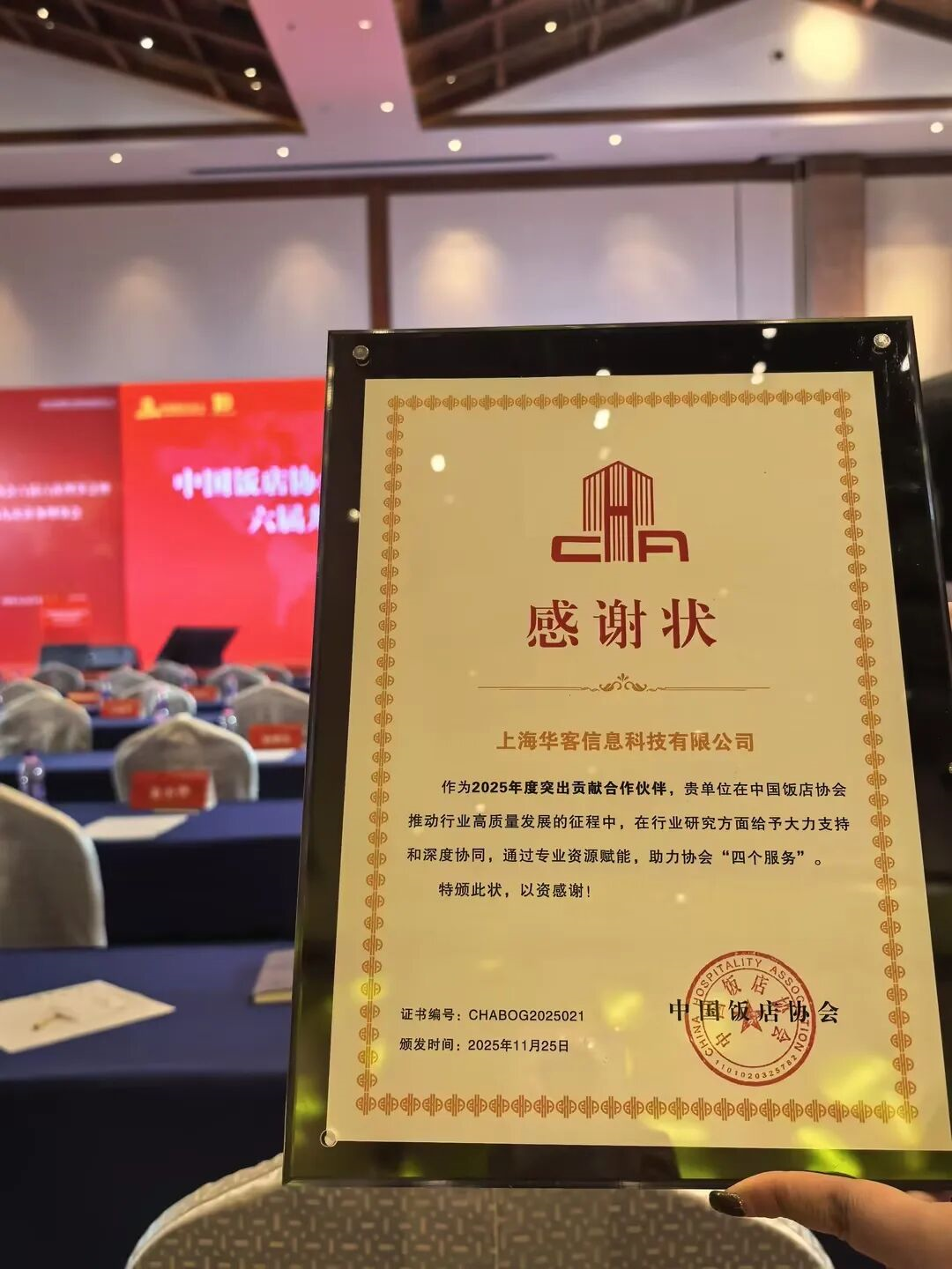 正值岁稔时和、硕果盈枝之际,华客也迎来了行业给予的两份肯定 —— 凭借在酒旅领域的服务积淀,成功收获来自中国饭店协会颁发的“年度突出贡献合作伙伴”感谢状,同时获评由迈点研究院发布的“运营管理系统类・2025 年酒店采购指数标杆品牌”奖项。中国饭店协会华客被授予“年度突出贡献合作伙伴”2025年11月25日,上海华客被中国饭店协会授予 “年度突出贡献合作伙伴”称号,感谢状明确表彰其在推动酒店行业高质
