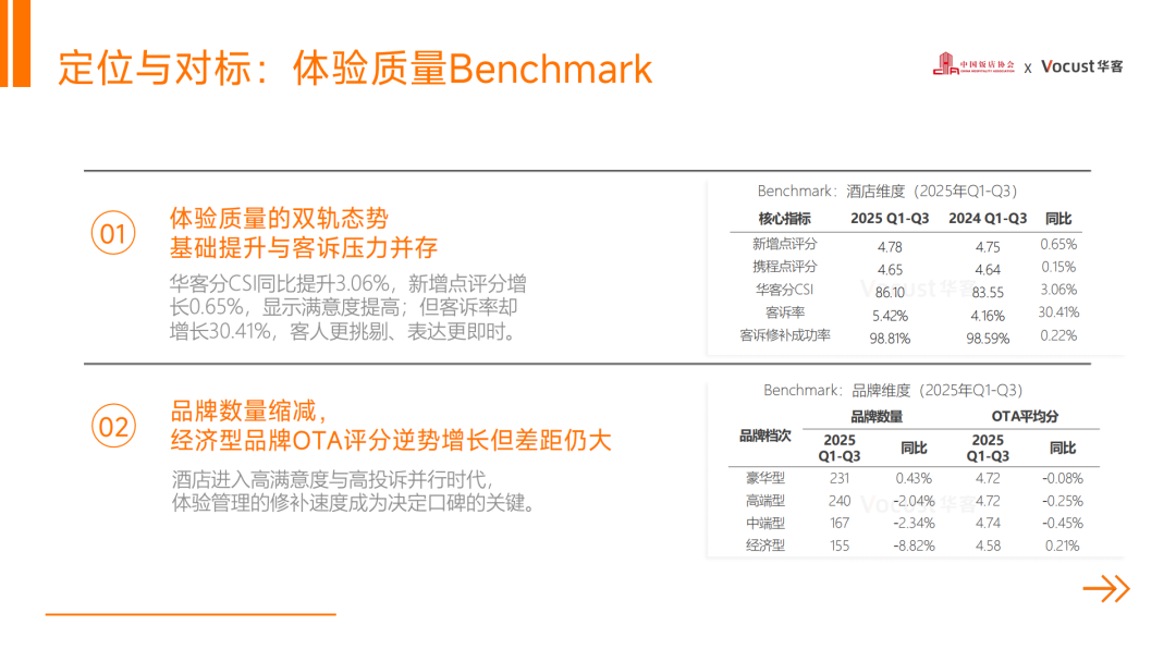 本年度报告延续了质量期望模型分析框架,覆盖全国多城市、多档次酒店海量运营数据,整合住宿业住前、住中和住后全场景体验服务质量,结合行业政策解读、体验趋势与标杆实践案例,为酒店业提供从数据基准参考到落地路径规划的多维度支持。