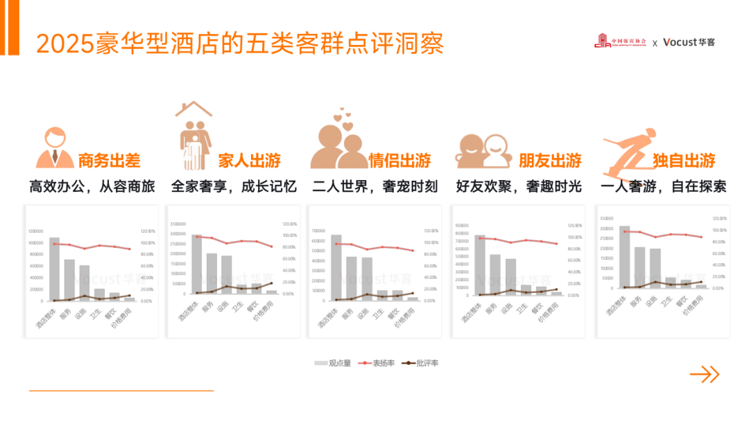 报告数据来源覆盖携程等国内OTA平台、华客 CEM体验云系统及问卷调研,地域囊括中国大陆及港澳地区。通过深度分析9200W+条点评的4.2亿+个观点、8400W+条住中客户之声的1.1亿+个观点,全面呈现豪华型、高端型、中端型、经济型档次酒店,及商务出差、家庭出游、情侣出游、朋友出游、独自出游五类客群的口碑趋势与运营变化。