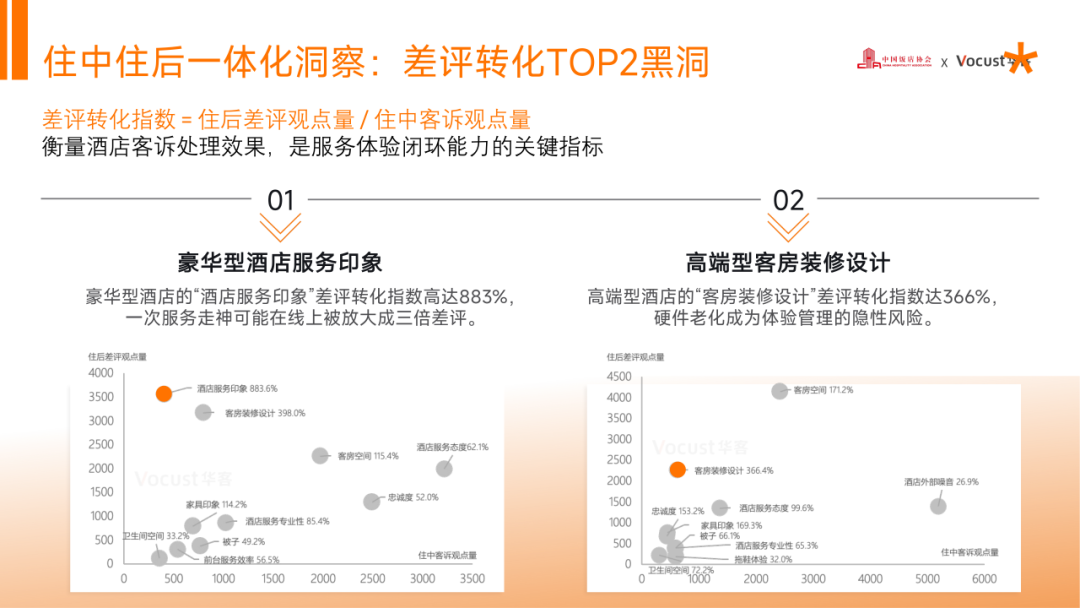 豪华酒店服务疏忽、高端酒店硬件老化等问题,易导致住中客诉在线上放大(如豪华酒店 “服务印象” 差评转化指数达 883.6%),这类问题成为酒店优化的重点方向。