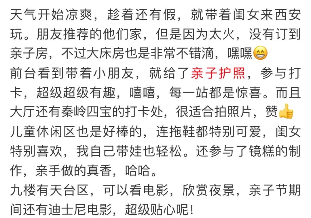 西安某亲子酒店就推出了“亲子护照”的店内互动游戏,在酒店各个位置设置了6个游戏关卡,包括:天台观影、拍照打卡等,家长不需要带孩子出门,就能在酒店里玩得尽兴,赢得不少好评。