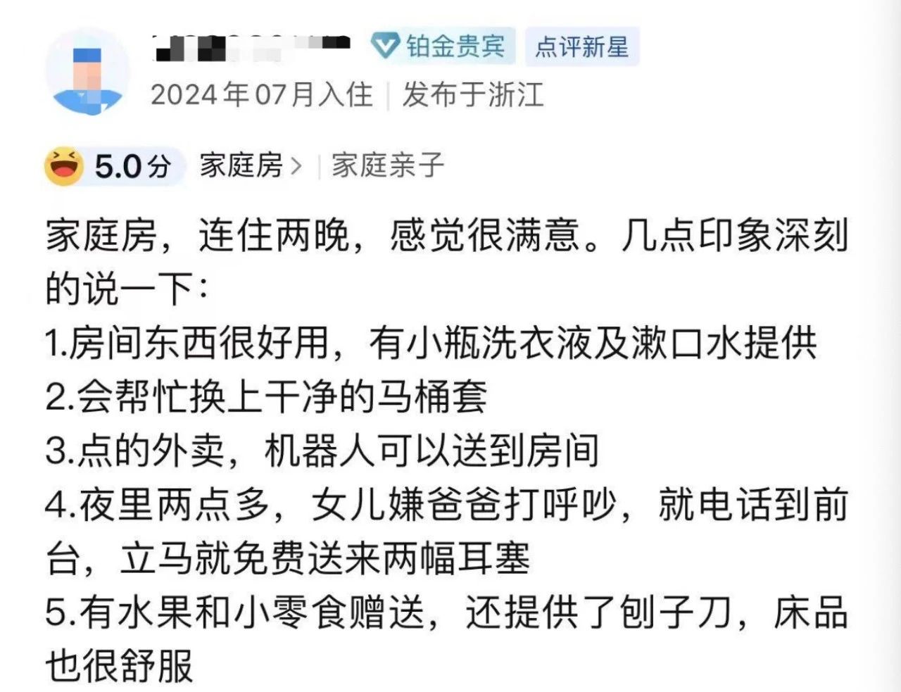 @浙江饭店另外,摆盘和色彩搭配也要注意,可以根据水果的“色彩、形状、种类”等特色进行排列,摆出高端大气上档次的氛围感。对于亲子、情侣或者过生日的客人,追求的是温馨,浪漫,中规中矩的礼物和布置是很难激发客人内心的丰富情感的。对于客人的生日,可以通过特殊欢迎礼凸显仪式感。比如客房部可以用花瓣、气球进行点缀,放上酒店的欢迎糖果。正如天津海河悦榕庄的客人在好评中分享的,”妈妈生日,酒店帮忙布置的,并且赠送了蛋糕果盘“。在节假日,仪式感的打造也分外重要。比如成都木棉花酒店在圣诞节为客人送上平安果、圣诞袜、祖马龙香水等等圣诞礼遇,以及SHAKE SHACK薯条券和柠檬茶券,也让客人兴奋不已,主动带图点赞。在外住宿,客人总觉得会缺少“家”的感觉,最主要的原因在于住店过程中的不方便。细心的酒店,就会将客人的出行需求充分考虑到客房物品的选择之中,比如常见的洗衣液、漱口水、耳塞等。另外针对不同客人的个性化需求,酒店可以提供定制化的客房用品。例如对于携娃出行的家庭,提供儿童专用拖鞋和浴袍,并作为伴手礼允许客人带走。