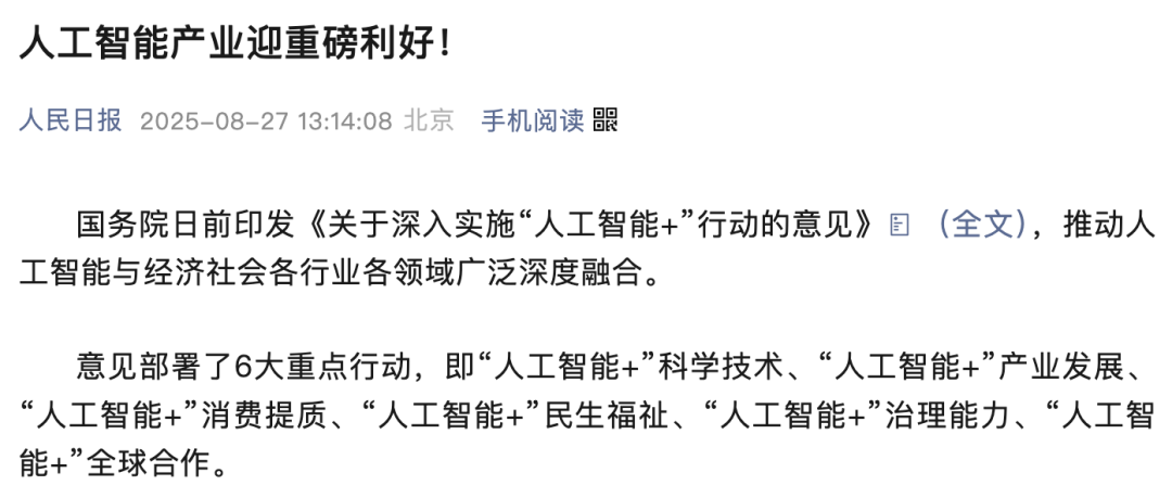 人民日报以 “人工智能产业迎重磅利好!” 为题,精准捕捉政策背后的产业推动力。