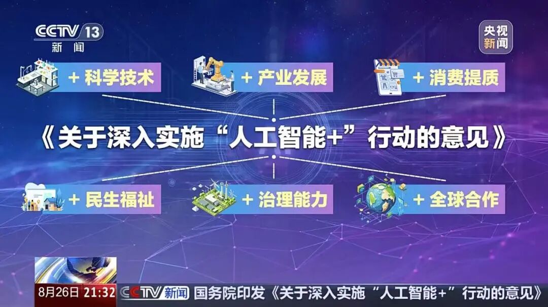 新闻联播则聚焦政策核心的 “六大行动” 展开深度解读,包括 “人工智能 + 科学技术” 加速科研范式革新、“+ 产业发展” 推进全链条智能化、“+ 消费提质” 培育智能终端生态、“+ 民生福祉” 优化公共服务、“+ 治理能力” 构建智能治理体系、“+ 全球合作” 推动技术普惠共享。