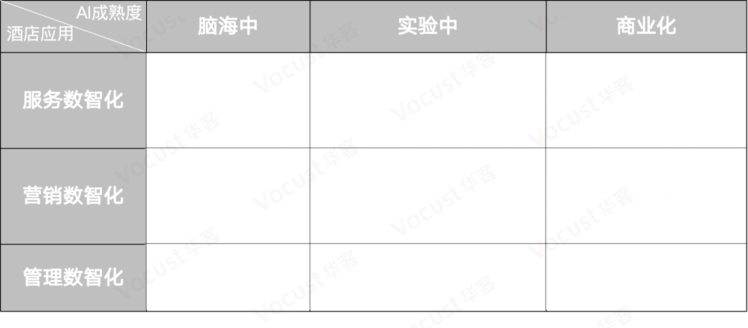 在 AI 技术落地场景的筛选上,行业内目前已有参考框架 —— 酒店 AI 实践九宫格。该框架从 “酒店应用场景” 与 “AI 实践成熟度” 两大维度出发,为酒店筛选适配的 AI 落地场景提供指引,其中,酒店应用场景包括: