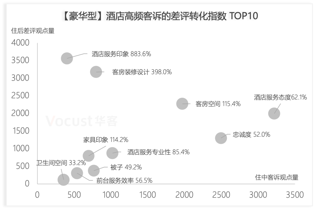 从开头数据图表中不难看出,豪华型酒店“服务印象”类高频客诉问题低于酒店服务态度、客房空间等显性问题。但它的差评转化指数,却超过其他所有维度——