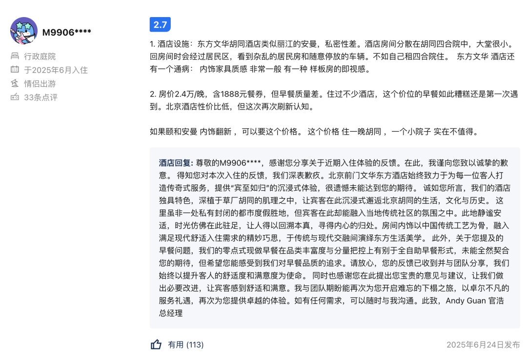 一位客人花2.4万/晚入住后,写下差评——吐槽酒店私密性差、早餐质量配不上价格,甚至直言“不如自己租四合院”。