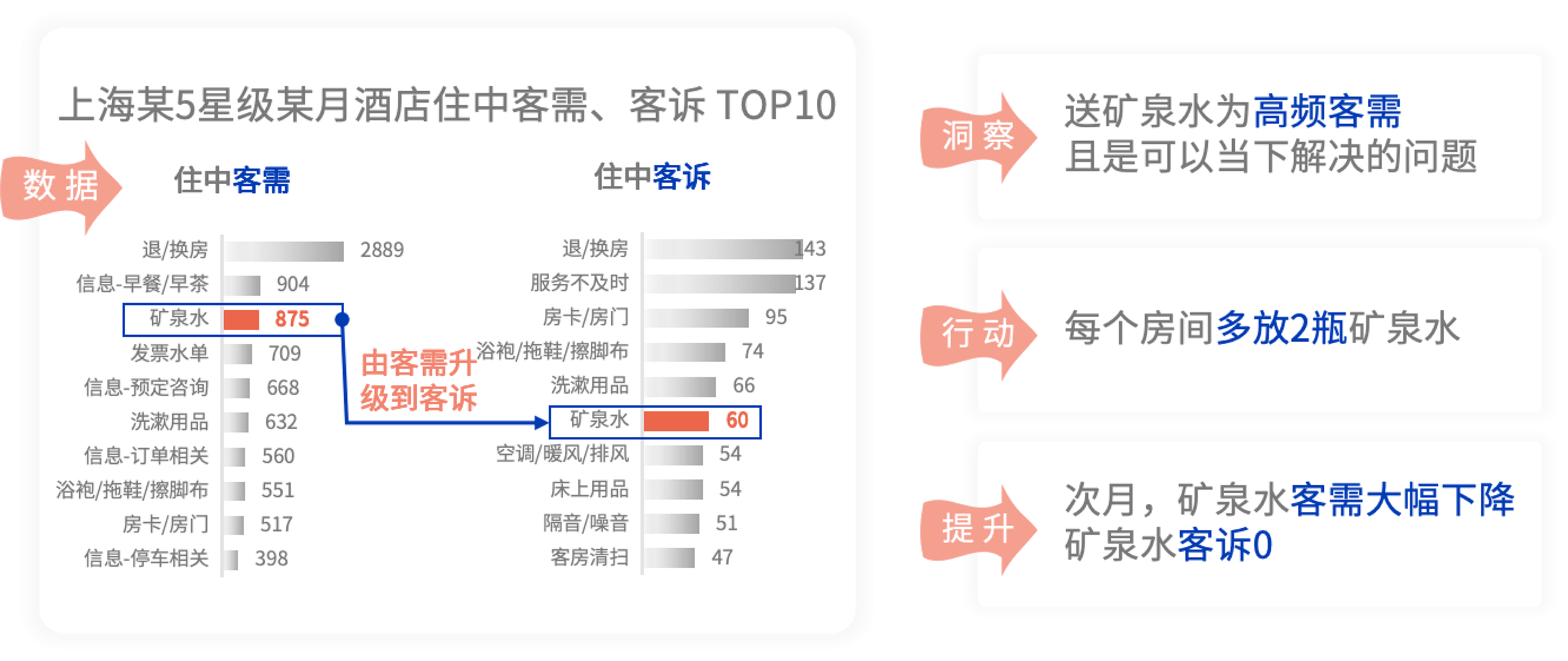酒店通过系统发现,很多客户投诉等待接驳车时间长,通过“接驳车”的高频客诉分析,改善了酒店由原先的单向接送到100%运力,实现了运力的最大化利用,减少客户等待时间。